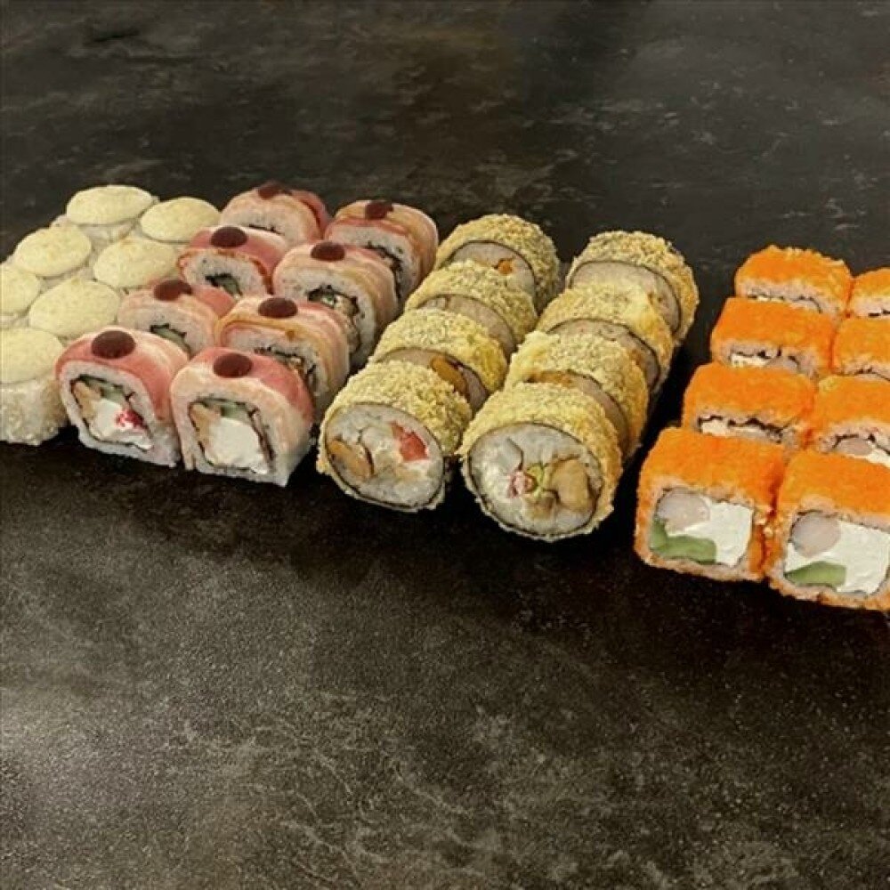 32 шт. Калифорния с креветками, Жаренный цезарь, Дон Бекон, Аригато. Бесплатный набор топпинга : Имбирь 30 гр, соевый сосус 100 мл, васаби 10 гр )