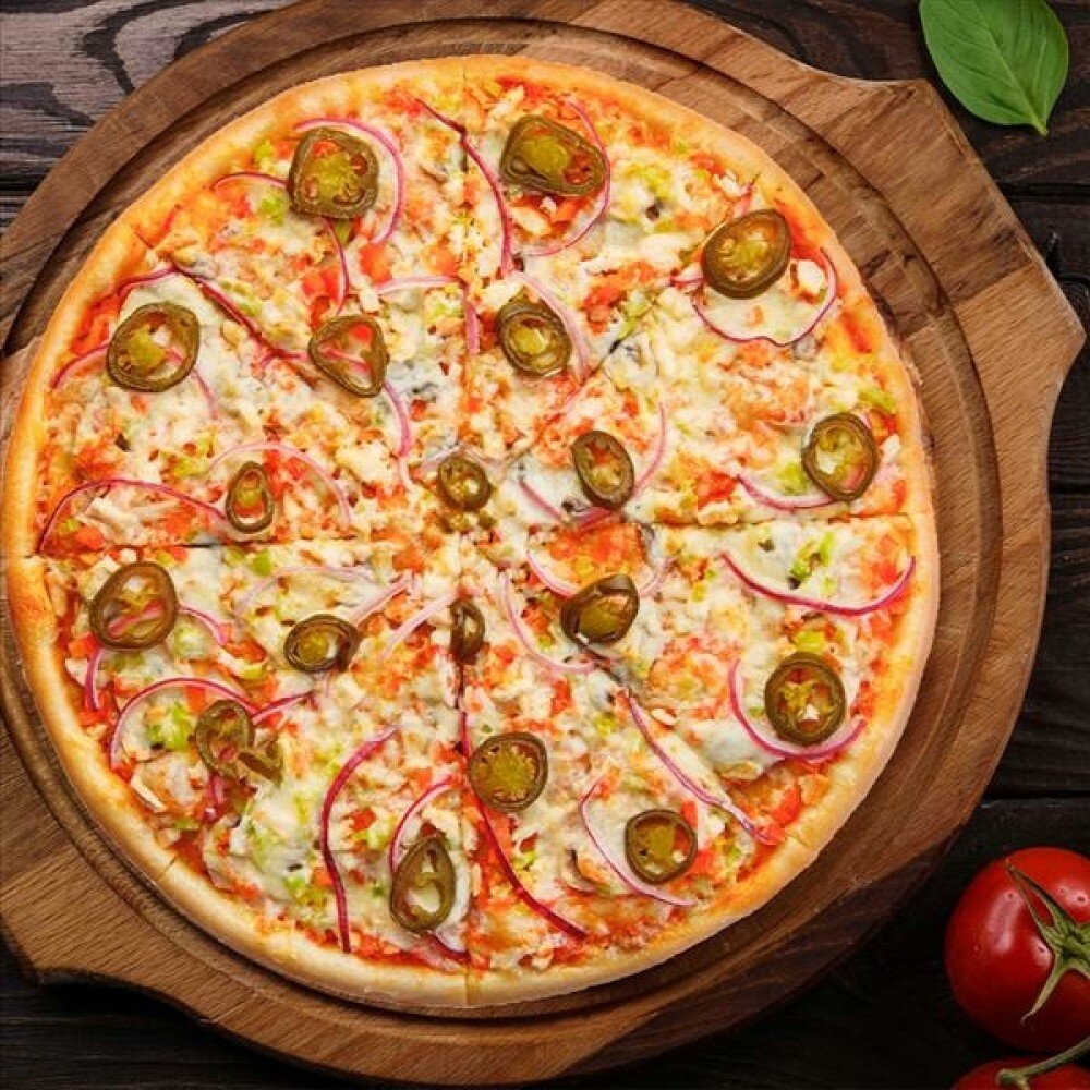 Для любителей поострее. Ветчина, томаты, лук красный, моцарелла, томатный соус, соус тобаско, холопенью перец 35 см