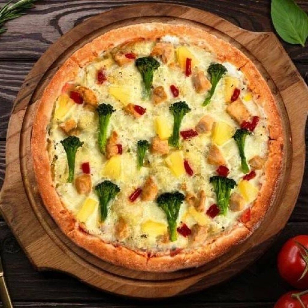 Моцарелла, белый соус , куриное филе , ананас, карамелизированный перец, брокколи