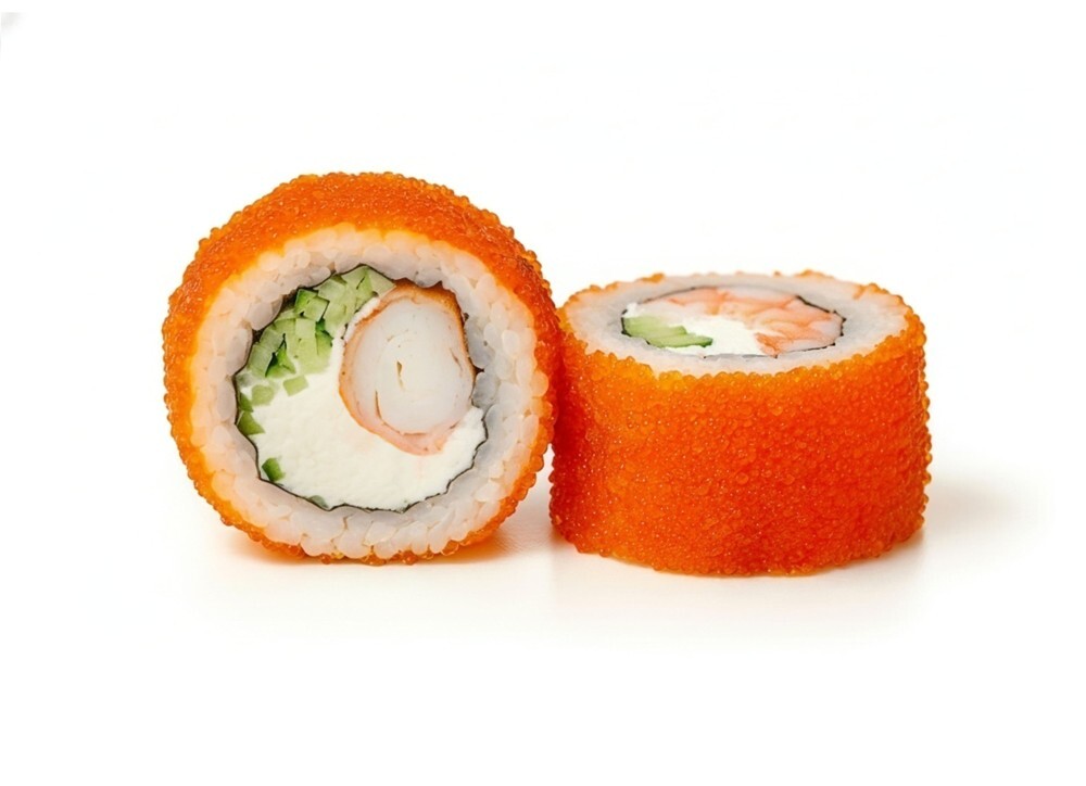 Кереветки тигровые, масаго икра, сыр, рис, нори, огурец