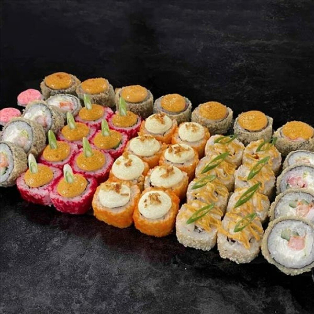 Запеченый ролл с лососем "Монако". : лосось, икра масаго, сырный соус для запекания, лук фри, огурец. сыр
