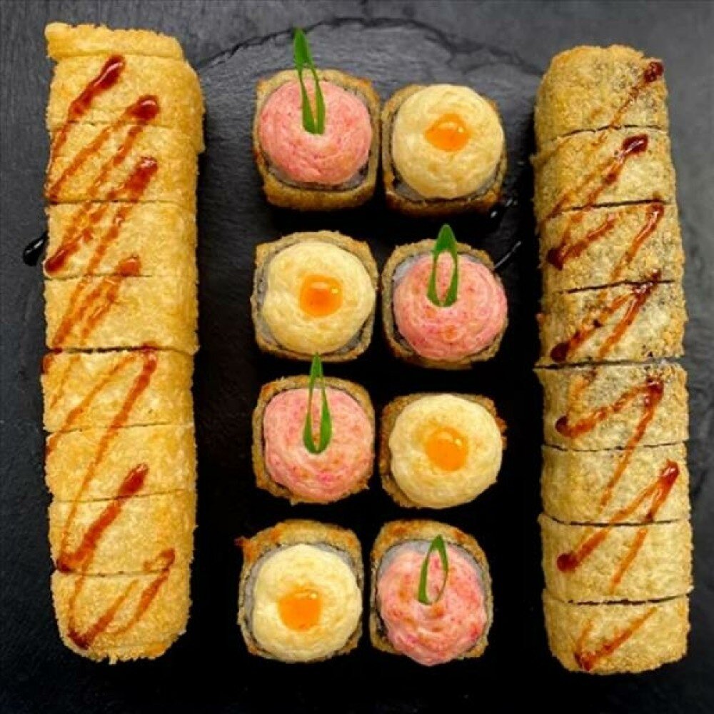Марокко : темпурный ролл с куриным филе обжаренным в соусе терияки, томаго, огурцом, дабл соусом , сырным соусом, луком, соусом чили манго
