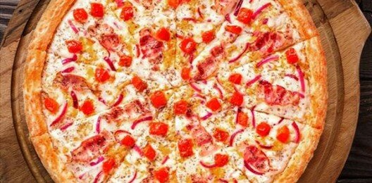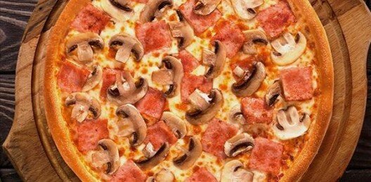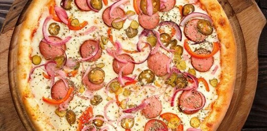 Пеперони, ветчина, шампиньоны, томаты, моцарелла, томатный соус, оливки, орегано