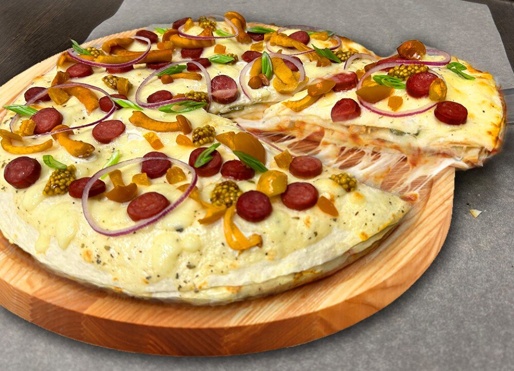 4 этажная пицца с 2 видами соусов , сыром моцарелла, томатом, корнишонами, маринованными опятами , беконом, красным и зеленым луком, деженской горчицей, охотничьими колбасками и курагой