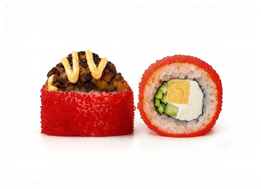 Запеченный ролл с тар таром из угря, соусом спайси, икрой масаго , сыром, огурчиком, томаго