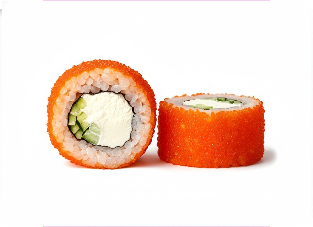 творожный сыр, хрустящий огурчик, рис, нори, красная икра масаго