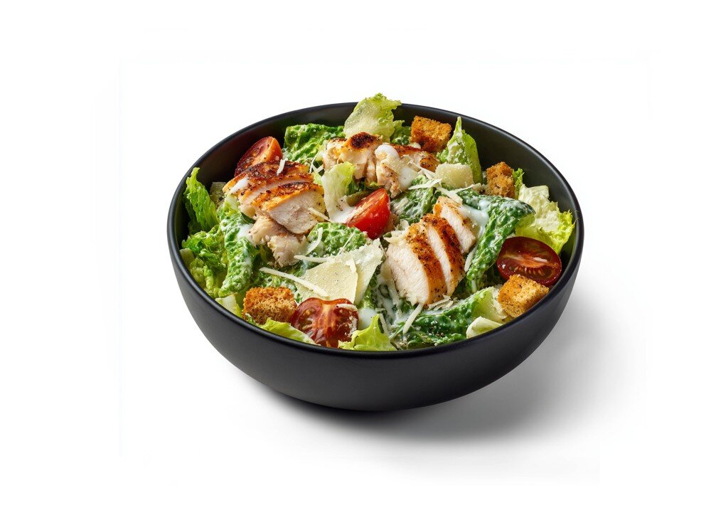 Классический салат с листьями хрустящего айсберга, куриным филе обжаренным в соусе сладкий чили , помидорками чери, пармезаном, соусом цезарь и хрустящими сухарями