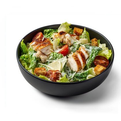 Классический салат с листьями хрустящего айсберга, тигровые креветки обжаренным в соусе сладкий чили , помидорками чери, пармезаном, соусом цезарь и хрусящими сухарями