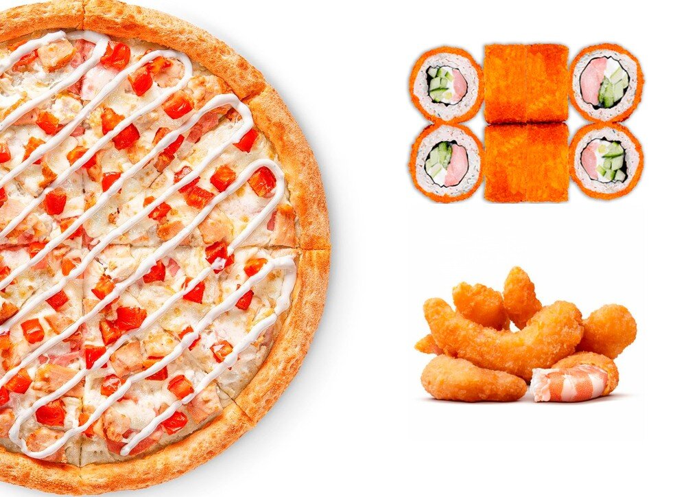 Цыпленок ранч пицца средняя Калифорния с креветками Креветки в темпури 5 шт