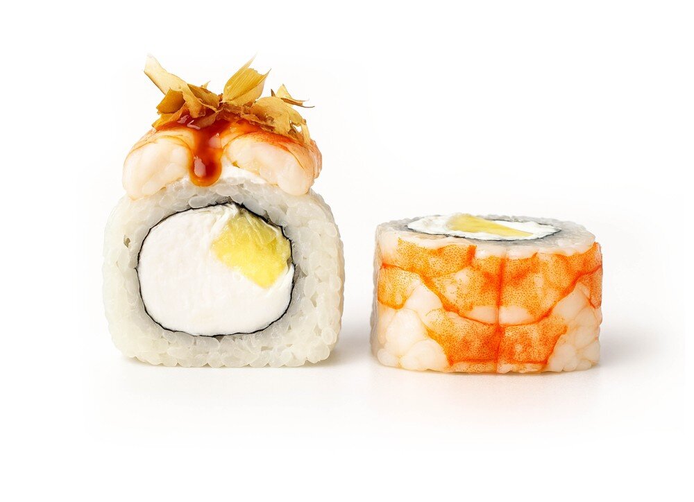 Тигровые креветки, сыр творожный, соус чили манго, стружка тунца, ананас