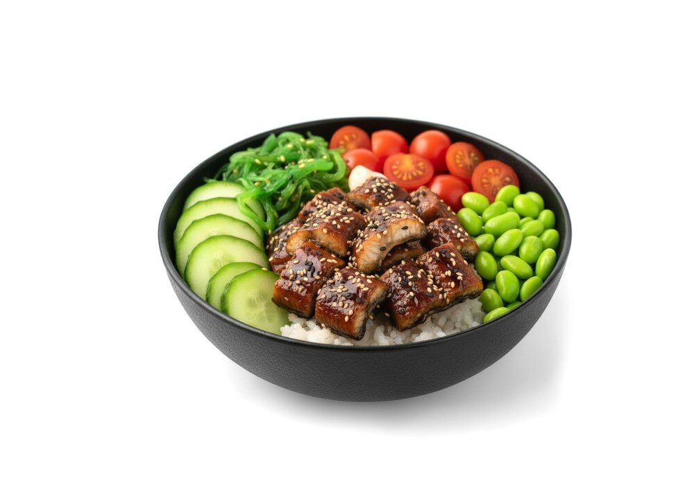 Поке с угрем обжаренным в соусе аунаги, чуккой и ореховым соусом , бобы эдаме, огурчик, томат, подается с фирменным сладковато пряным соусом томикацу