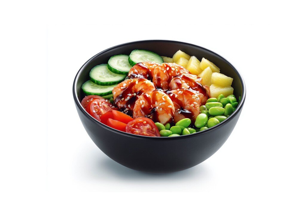 Поке с креветками под соусом терияки , бобы эдаме, огурчик, томат, ананас, подается с фирменным сладковато пряным соусом томикацу