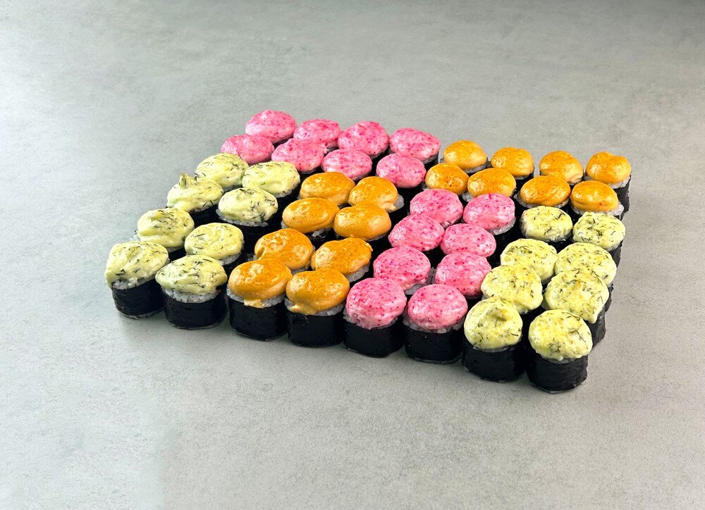 Сет из запеченыйх мини роллов под острым соусом спайсиЮ сырным чесночным соусом и лава соусом с икрой масаго :