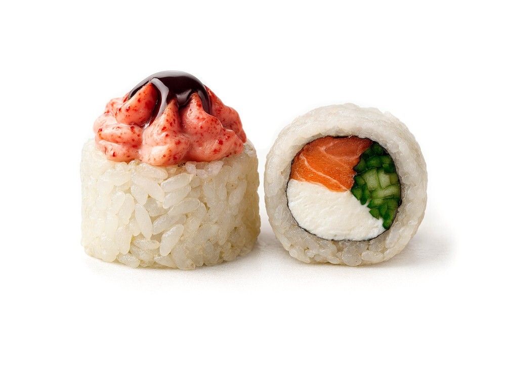Ролл с лососем сыром, огурчиком соусом терияки и соусом лава (сыр, майонез, икра масаго, терияки)